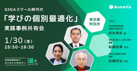 学習eポータル+AI型教材「キュビナ」を開発・提供する株式会社COMPASS(本社:東京都文京区、代表取締役:佐藤 潤、以下 COMPASS)は、全国の自治体・学校教育関係者向けに、ICT教材を活用した「学びの個別最適化」の実践事例を紹介するオンラインセミナー「キュビナレッジ(Qubena×Knowledge)」第10弾を、東京都町田市をゲストに迎えまして1月30日(木)に開催することをご報告いたします。