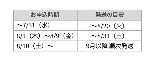 発送目安 お申し込みから発送までの目安については、下記の表をご参照ください。