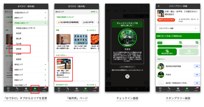 ・クーポン情報やイベント情報:アプリ内の「おでかけ」タブの「福井県」ページにて、配信します。