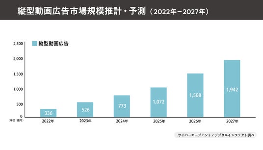 また、株式会社サイバーエージェントと株式会社デジタルインファクトが共同で行った「2023年国内動画広告の市場調査」(※5)によると、縦型動画広告の需要が急増しており、2023年の市場規模は526億円(2022年比156.3%)に到達し、2024年は773億円、2027年には1,942億円に達する見込みと発表されています。