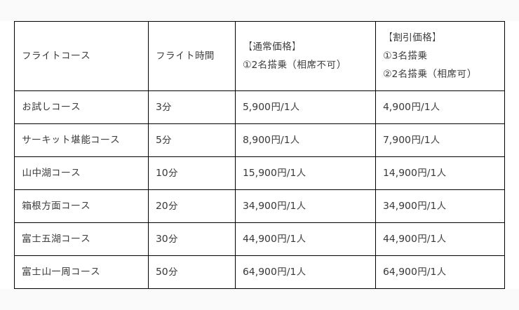 ※機体は定員3名(1フライト貸切)、重量制限:165kgまで