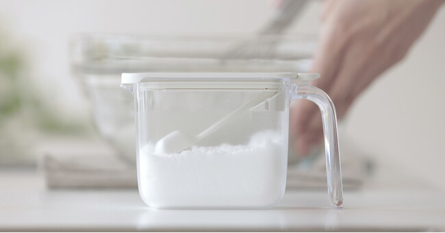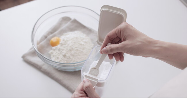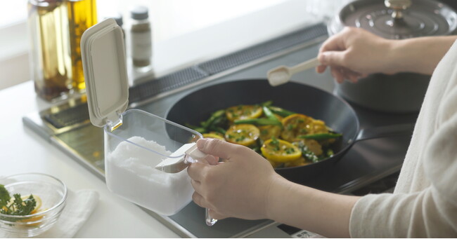 密閉性とワンタッチオープンなどの操作性を兼ね揃えた調味料入れ。シリコーンゴムのパッキンで湿気を防ぎ、調味料が固まりにくく、手元のボタンを押すとしっかり閉まっていてもワンタッチで開きます。既存の調味料入れは、持ち手側にフタが開くのに対し、「調味料ポット」はフタが奥に開くため、調理中もさっとすくえます。容器の内側にはすり切り板が付いており、付属のスプーンで小さじ1杯分を簡単にすり切りれます。スプーンは、すり切り板に立て掛けると調味料に埋もれず収納できます。