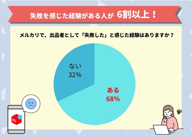 ・メルカリ出品に失敗したと回答した人は68%、失敗した経験は無いと回答した人は32%でした。
