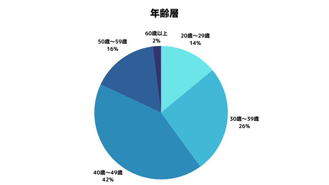 回答者の年齢層は40歳~49歳が最も多く42.0%、次に30歳~39歳が多く26.0%という結果になりました。