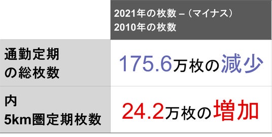 定期券の販売実績及び各駅の座標情報を分析することで、鉄道による通勤規模および通勤距離を把握しました。結果、首都圏では通勤者数自体が減少する中で、通勤距離が相対的に短い通勤者(5km未満)がこの10年で約24万人増加したことが判明しました。