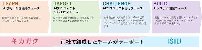 ユーザー企業が実際のAIプロジェクトの進め方を学ぶフェーズです。ユーザー企業とISIDのメンバーでチームを組成し、共同でAI/データ活用プロジェクトを実施する「並走型支援」と、ユーザー企業がチームを組成してAI/データ活用プロジェクトを実施し、ISIDがプロジェクト推進を支援する「自走型支援」の2通りの支援方法があります。
