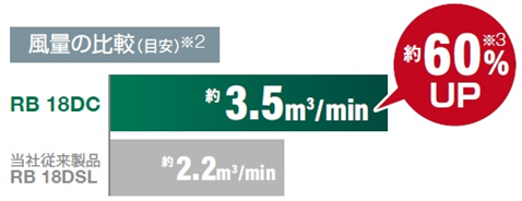 風路構造の最適化により、クラストップ※1の大風量で、当社従来製品RB 18DSLに比べ風量が約60%アップしています。