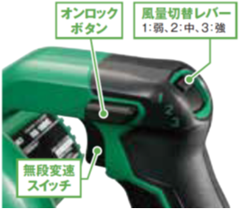 スイッチを最大に引いたときの風量を強・中・弱の3 段階に調整できる風量調整機能と、無段変速スイッチで思い通りの風量調整ができます。また、オンロックボタンを搭載し、連続作業も楽にできます。