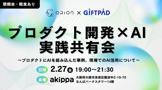 企業や自治体のDXを支援する株式会社ギフトパッド(本社:大阪府大阪市、代表取締役:園田 幸央、以下ギフトパッド)は、2026年2月27日(金)にエンジニアコミュニティ【ORION】が主催する「プロダクト開発×AI実践共有会~プロダクトにAIを組み込んだ事例や、現場でのAI活用について語り合おう~」に、取締役の田原 啓介が登壇することをお知らせいたします。