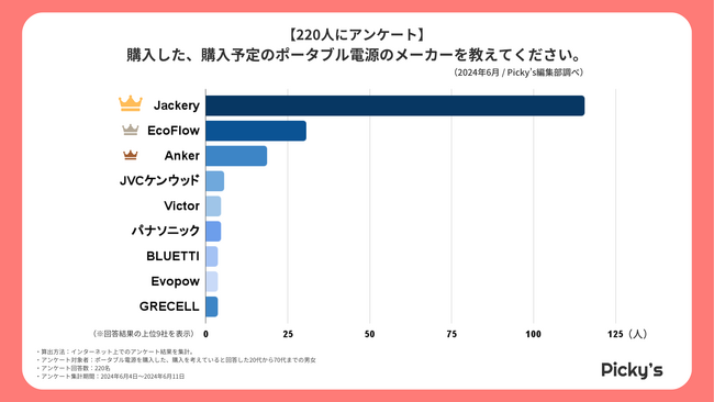 「Jackery」が最も多い結果となりました。続いて「EcoFlow」、「Anker」が選ばれています。