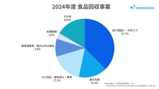 実際に、厚生労働省が公開している食品の自主回収(リコール)情報(2024年度分)をカミナシが分析した結果、ラベルの貼付間違いや記載ミス、表示欠落など、ラベルに起因する自主回収が312件あり、公開された全情報586件中の53%にあたることが判明しました(※)。これらの事案は企業にとって多大な経済的損失だけでなく消費者からの信頼失墜のほか、食品廃棄(食品ロス)にもつながり、社会的な損失にもなりかねない課題です。