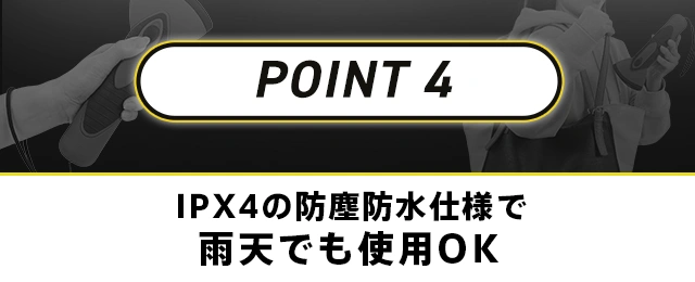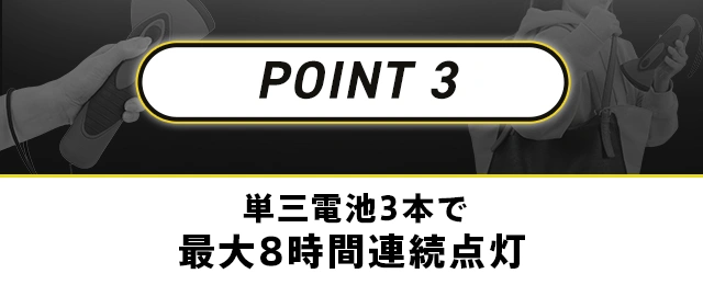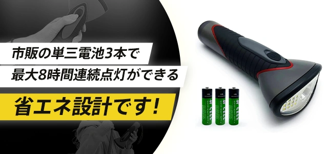 単三電池3本で最大8時間連続点灯できる省エネ設計。IPX4の防塵防水機能で雨天の使用もOK