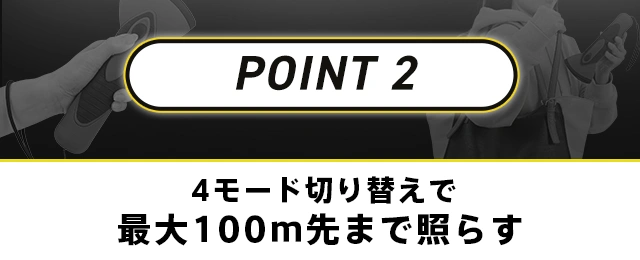 ライト機能は4モードを搭載。通常モードなら100m先まで光が届く