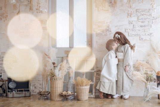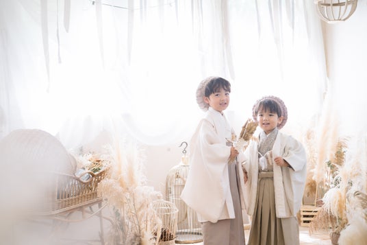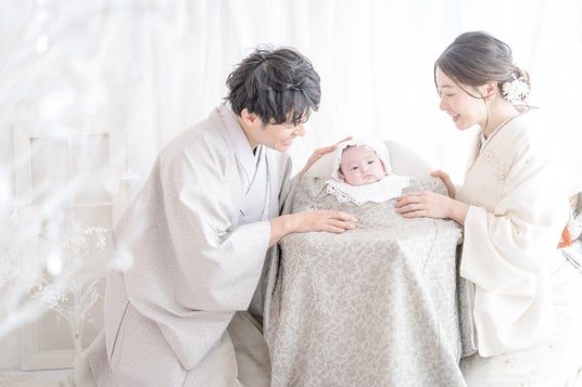 特に、ビンテージとは異なる味わいのコフレオリジナル和装は七五三撮影でも大変人気が高く、ごきょうだいやご家族様のトータルコーディネートのご提案や、お⾐装のレンタルも可能です(※4)。お宮参りの産着レンタルサービスも承っており(※5)、撮影前後1か月の期間であれば無料でご利用いただけます。