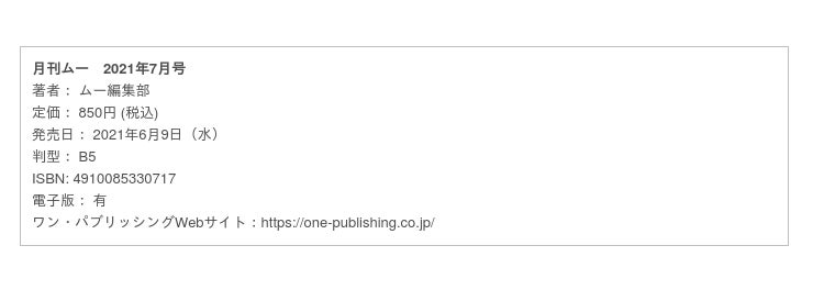 株式会社 ワン・パブリッシング(東京都台東区/代表取締役社長:廣瀬有二)は、2021年6月9日(水)に月刊「ムー」7月号(定価:850円(税込))を発売いたしました。月刊「ムー」は世界の謎と不思議に挑戦するスーパーミステリー・マガジンです。