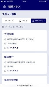 試合日程、スタジアムの最寄り駅到着時刻と出発時刻、観光スタイルを選択すると、選択した情報に合わせて最適な観光プランをAIが生成します。また、生成された観光プランに対する要望を自然言語で入力すると、入力内容に応じて観光プランを修正します。なお、アビスパ福岡の公式コミュニティ「アビスパDAO」でサポーターや地域の皆さまから寄せられた、飲食店や観光地の情報・口コミから、観光プランの作成に必要なデータを抽出・集約します。