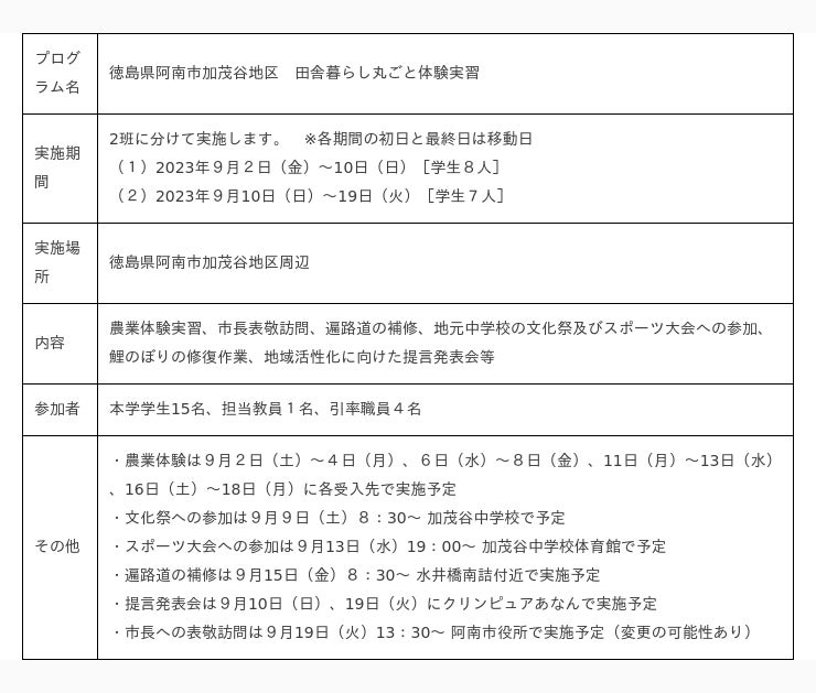 阿南市でのプログラム実施は2019年以来、4年ぶりに対面での実施となり、加茂谷地区での農業体験や地元住民との交流、遍路道の補修作業等を行う予定です。各期間の活動最終日には「提言発表会」を実施し、学生達が考案した加茂谷地区の地域活性化策の提言を、加茂谷元気なまちづくり会の方々を対象に発表します。
