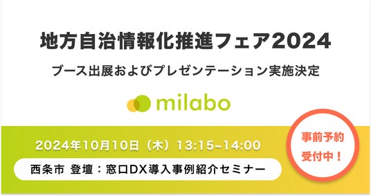 自治体向けサービスを開発する株式会社ミラボ(本社:東京都千代田区、代表取締役:谷川一也、以下「ミラボ」)は、2024年10月9日(水)~10日(木)千葉県・幕張メッセで開催される「地方自治情報化推進フェア2024」に出展します。