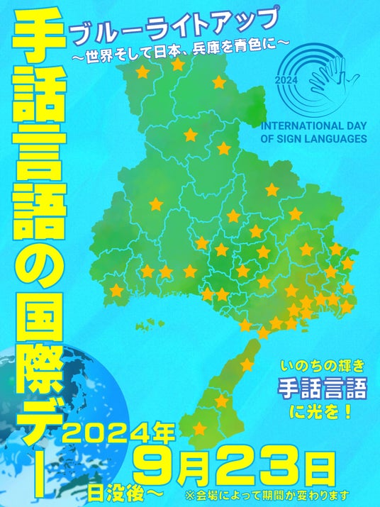 この呼びかけに応じ、全日本ろうあ連盟では今年も「世界そして日本を青色に! 手話言語をブルーライトで輝かせよう」市民・地域・社会をひとつにチャレンジプロジェクト 2024 として、「手話が言語である」ことへの認知を広めるため、ランドマークや公共施設を青色にライトアップすることを呼びかけています。(青色は世界ろう連盟や国連のロゴの色を示しており、平和を表しています。)