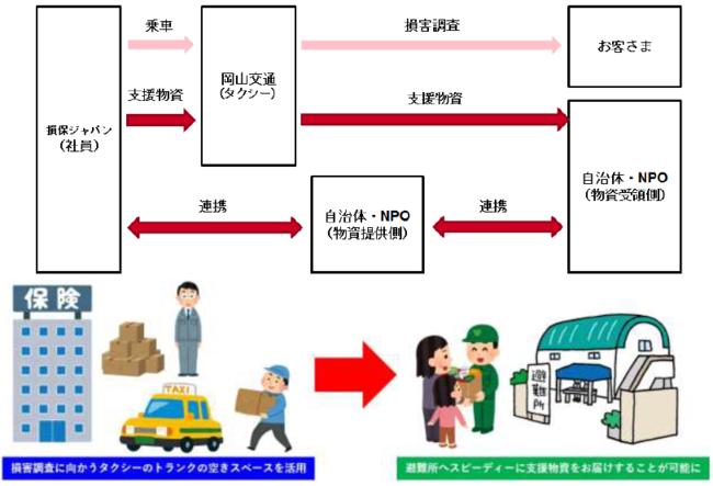 損害保険ジャパン株式会社 (取締役社長:白川 儀一、以下「損保ジャパン」)は、岡山交通株式会社(代表取締役:土江 富雄、以下「岡山交通」)および、特定非営利活動法人岡山NPOセンター(代表理事:石原 達也、以下「岡山NPOセンター」)と災害発生時の支援物資の運搬スキームの構築を中心としたレジリエンスな岡山の実現に向け、3者間包括連携協定を締結しましたのでお知らせします。