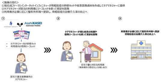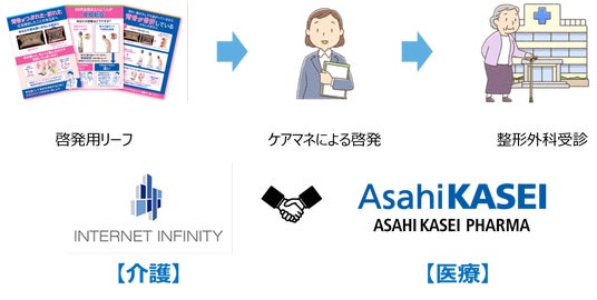 このような課題に対して、骨粗鬆症について深い知見を持つ旭化成ファーマと、介護事業者とのネットワークを持つインターネットインフィニティーの両社の強みを生かした、ケアマネジャーを介した骨粗鬆症の診断・治療を促す啓発活動を開始しました。