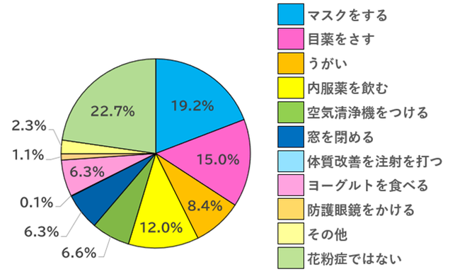 花粉症対策としては「マスクをする」「目薬をさす」「内服薬を飲む」と回答した方が多い結果になりました。
