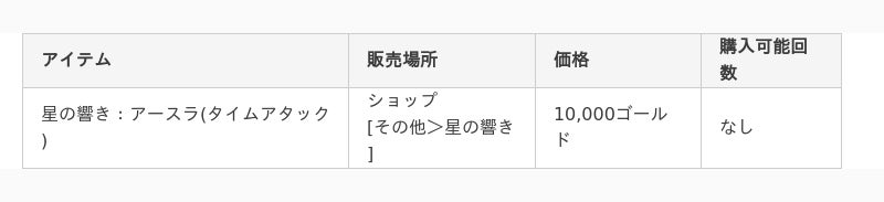 ※「星の響き:アースラ(タイムアタック)」は、「メインクエスト ストーリー Chapter4 Ep.8」クリア後に[ショップ>その他>星の響き]に表示され、購入することが可能です。