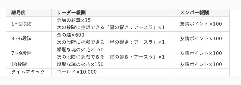 ・「星の響き:アースラ(1~10段階)」はパーティ(最大3名)で、「星の響き:アースラ(タイムアタック)」は1名でのみ挑戦することができるコンテンツです。