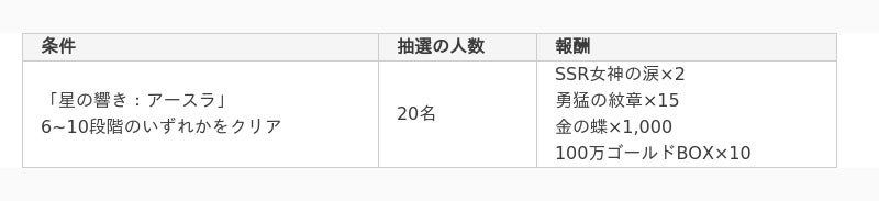 イベント開催期間中、「星の響き:アースラ」に挑戦し、それぞれ以下の条件を満たす方を対象に抽選を行い、選ばれた方に報酬を配布いたします。