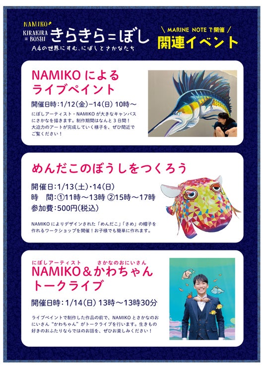 AQUARIUM×ART atoa(中央区新港町、以下「アトア」)では、2024年1月12日(金)から開催する”にぼしアーティスト NAMIKO氏”とのコラボ企画展「きらきら=ぼし展」のオープニングイベントとして、NAMIKO氏のサイン会を2024年1月14日(日)に実施します。