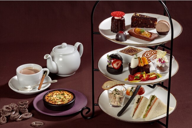 「アフタヌーンティーセット~チョコレート×フルーツ~」は、チョコレートとフルーツの組み合わせを楽しめるスイーツとセイボリーを盛り合わせた1、2月限定のメニューです。パッションフルーツとチョコレートを合わせたチョコブリュレやレモンが香るティラミス大福、濃厚な甘さと栄養価の高さから注目を集めているナツメヤシの実、デーツを使用したブラウニーなど9種類のスイーツをご用意しました。これまで味わったことのない新食感・新しい味わいを皆さまにお届けします。