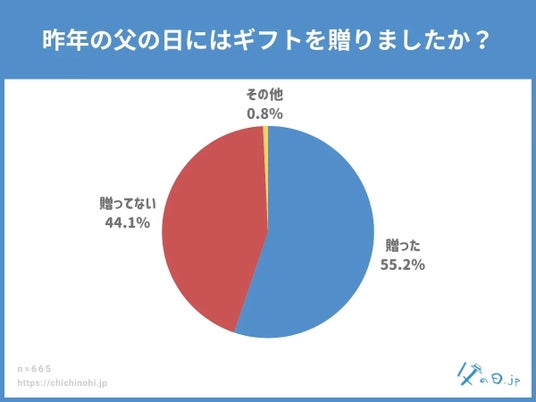 父の日についての様々な情報を発信している、父の日に特化した情報メディアサイト「父の日.jp」では、全国の10代~70代の男女(計665名)を対象に「昨年の父の日にはギフトを贈りましたか?」、「昨年の父の日はどのように過ごしましたか?」というアンケートを実施し、調査データを公開しました。