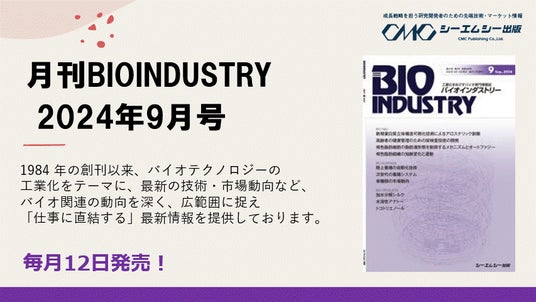 株式会社シーエムシー出版(本社:東京都千代田区、代表:辻賢司)は、雑誌『月刊BIOINDUSTRY 2024年9月号』を9月12日に発売しました。紙媒体の「雑誌版」は税込6,050円(本体価格5,500円+税)で、当社ECサイト及び全国の書店でご注文を受け付けております。また同時に「電子版」も、電子書籍販売サイト「CMCeBook」にて税込5,500円(本体価格5,000円+税)で販売します。
