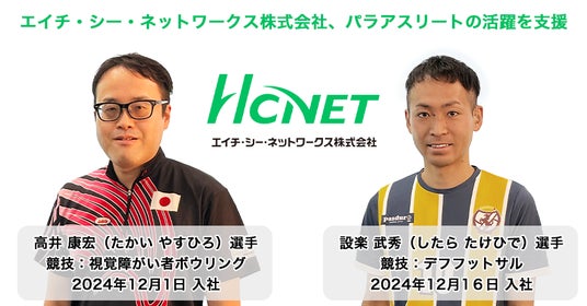 エイチ・シー・ネットワークス株式会社(本社:東京都台東区、代表取締役 田中 宗、以下HCNET)は、困難から未来を創造する象徴として、パラアスリートの活動に共感し、パラアスリート2名の雇用と活動支援をスタートしました。