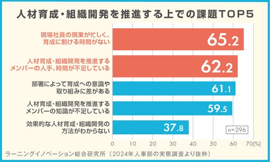 デジタル技術の発展、AIの台頭など、働き方や企業を取り巻く外部環境の変化により、従業員に求められるスキルも変化しています。多くの企業が社員の育成・成長・定着に課題を感じる中、人材育成・組織開発を推進する上で抱える課題は、人的リソース不足に関する回答項目が上位を占めました。(下図参照)