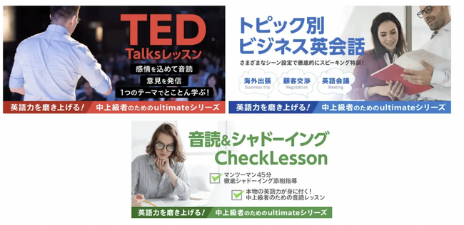 新たに中上級向けの3コースがラインナップ。英語学習者に大人気のTED Talksを使って、音読特訓からディスカッション、プレゼン練習をとことん行うTED Talksレッスン、顧客交渉や英語会議などリアルなシーン設定で状況説明やディスカッション課題を行うビジネスシーン別英会話コースなど、中上級者向けのレッスンが充実しました。初めてのビジネス英会話からより実践的な英会話まで、あなたのレベルに合わせて英語を学ぶことができます。どのコースからスタートすべきか、無料カウンセリングでスタッフがご案内しますので、まずはカウンセリングにご予約ください。