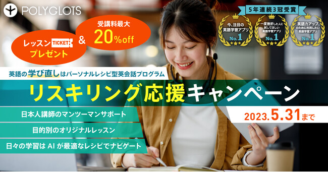 株式会社ポリグロッツ(本社:東京都新宿区、代表取締役:山口隼也)は、5月15日(月)~5月31日(水)まで英語の学び直しを後押しするリスキリング応援キャンペーンを開催いたします。開催期間中は、パーソナルレシピ型英会話プランを最大20%OFFでご提供します。さらに、レッスンチケットもプレゼント!このお得な機会に、英語学習を強化してください。