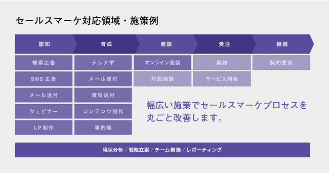 「CASTER BIZ セールスマーケ」は、リードや商談が増える施策を実行するセールスマーケティング専門サービスです。クライアントの課題や状況に合わせて、戦略立案から実行まで専属の担当者がリモートで推進します。最短3日で専門チームを立ち上げ、セールスからマーケティングまで一貫して支援することで、幅広い施策でセールス・マーケティングのプロセスを改善し、クライアントの成長に寄与します。
