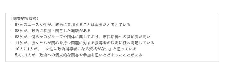 日本から参加した15歳~24歳のユース女性1000人から得られた結果では、「女の子やユース女性が政治に参加することは重要ではない」という意見に同意する人は、世界的にはわずか3%であるのに対し、日本では10%と高い割合となりました。