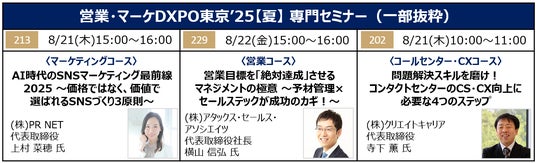 本展では、業界の有識者を講師に招いた「専門セミナー」も同時開催する。マーケティングコースでは、マーケティングの本質やSNSのトレンドについて1万人以上に講演を行っている(株)PR NET 代表取締役 上村菜穂氏が、生成AIを活用した最先端のSNS集客術を解説、また営業コースでは、予材管理の考案者として知られる(株)アタックス・セールス・アソシエイツ 代表取締役社長 横山信弘氏が、営業目標を絶対に達成させるマネジメントの極意を紹介するなど、営業・マーケティング部門をはじめ、売上アップ・生産性向上を目指す経営者必聴のセミナーが多数開催される。