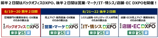 代表取締役社長 新村祐三、東証グロース上場 証券コード:9272)は、8月21日(木)・22日(金)の2日間、第4回 営業・マーケDXPO東京’25【夏】を東京ビッグサイトにて盛大に開催する。来場対象者は、DX推進に課題を持つ経営層に加え、営業、マーケティング、Web担当、集客・販促・PR担当の方々である。