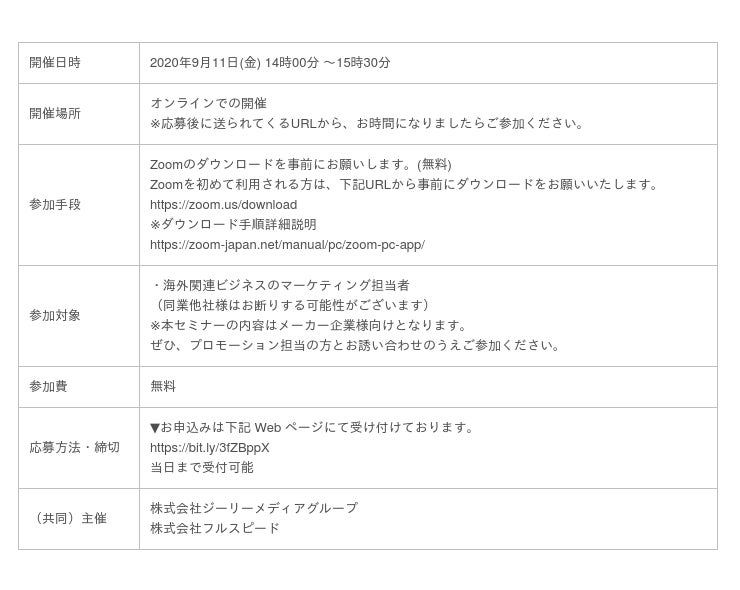 インターネットマーケティング支援を行う株式会社フルスピードは、台湾最大の訪日観光情報サイト「樂吃購(ラーチーゴー)!日本」を運営する株式会社ジーリーメディアグループとの共催で、中国・台湾向け越境ECに関する無料オンラインセミナーを、2020年9月11日(金)に開催いたします。