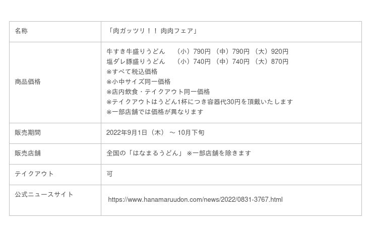 讃岐うどんチェーン「はなまるうどん」を展開する株式会社はなまる(本社:東京都中央区 代表取締役社長:前田良博、以下はなまる)は、2022年9月1日(木)より、全国(※一部店舗除く)のはなまるうどんにて、「肉ガッツリ!!肉肉フェア」を実施いたします。
