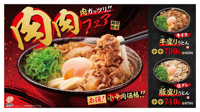 肉ガッツリ!!牛・豚2種の肉うどん、どちらもお得な小中同価格で期間限定発売!