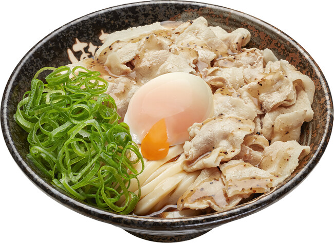 「塩ダレ豚盛りうどん」は、温かいうどんとはなまる特製つけだしに豚バラ肉と青ねぎをたっぷり盛り付け、半熟たまごをトッピングしています。豚バラ肉と塩ダレの組み合わせがうどんによく合い、やみつきになる味です。