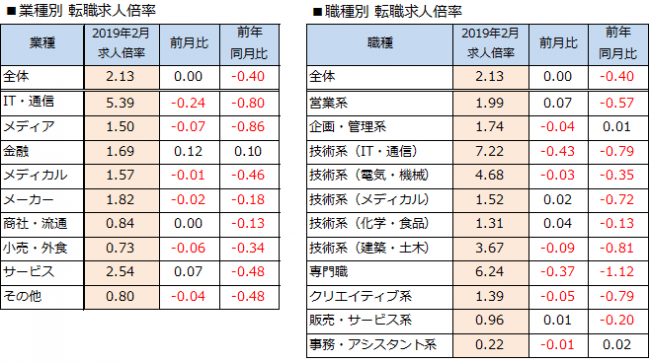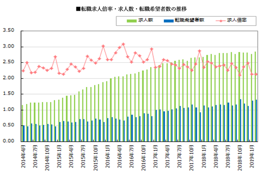 2019年2月の転職求人倍率は、前月と同じく2.13倍となりました。求人数は前月比102.4%、前年同月比103.7%となりました。転職希望者数は前月比102.4%、前年同月比123.1%でした。