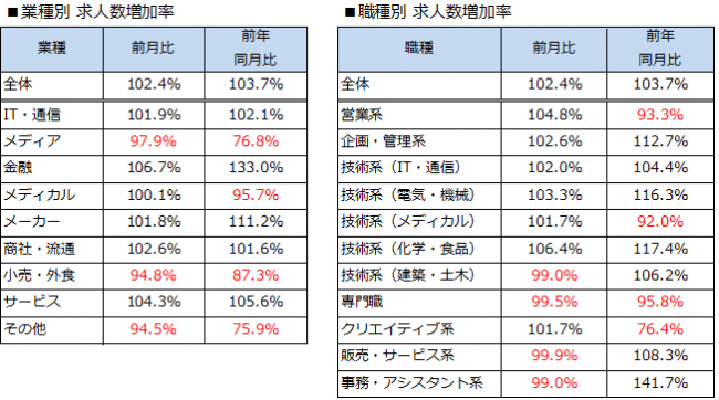 業種別にみると、「その他」を除く8業種のうち「金融」「サービス」「商社・流通」「IT・通信」「メーカー」「メディカル」の6業種で求人数が増加しました。求人の増加率が特に高かったのは、「金融」(前月比106.7%)、「サービス」(前月比104.3%)でした。職種別では11職種のうち「技術系(化学・食品)」「営業系」「技術系(電気・機械)」「企画・管理系」「技術系(IT・通信)」「技術系(メディカル)」「クリエイティブ系」の7職種で求人数が増加しました。求人の増加率が特に高かったのは、「技術系(化学・食品)」(前月比106.4%)、「営業系」(前月比104.8%)でした。