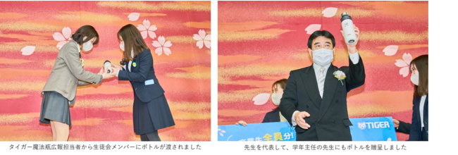 その後、タイガー魔法瓶の広報担当者が、舞台上で卒業生代表の生徒にオリジナルデザインのタイガーボトルを贈呈。生徒会を務めていた卒業生は「コロナ禍で始まった高校生活、辛いこともありましたが、今思うととても充実した3年間でした。皆ばらばらになってしまうけど、この魔法瓶を使って、大学生活を楽しみたいと思います。普通の高校生が行う行事を制限なしでできたのが卒業式が初めてで、とても思い入れのある嬉しいイベントに、使う度に青春のひとときを思い出せるような魔法瓶のプレゼントをいただけて感謝の気持ちでいっぱいです。」と思いの丈を語りました。