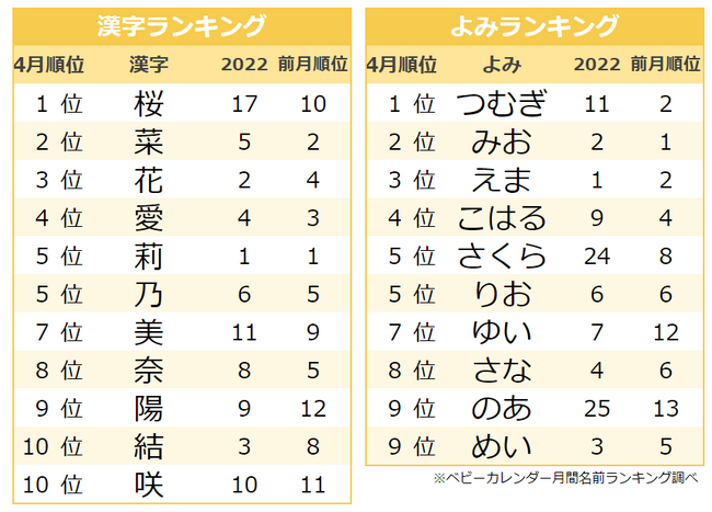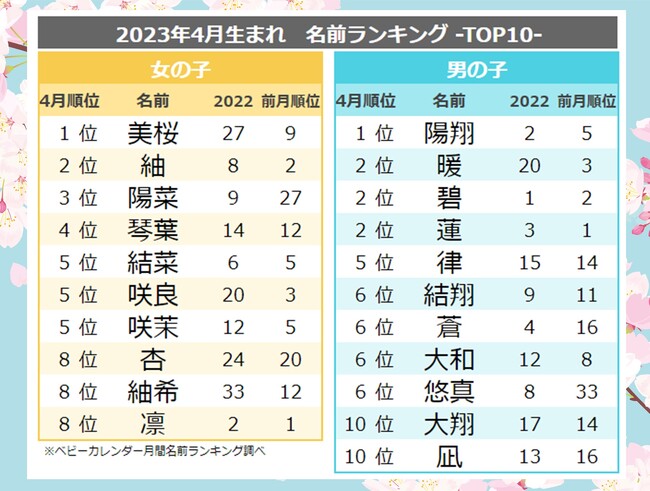 4月生まれの女の子の名前で首位に躍り出たのは、「美桜(主なよみ:みお)」。2月は90位でしたが、3月に9位へ大きくランクアップし、4月は1位に! さらに、5位「咲良(主なよみ:さくら)」、11位「桜(主なよみ:さくら)」、13位「さくら」、20位「未桜(主なよみ:みお)」、28位「凛桜(主なよみ:りお)」、38位「凪桜(主なよみ:なぎさ)」、46位「桜音(主なよみ:おと)」、46位「莉桜(主なよみ:りお)」と、TOP50位以内に「サクラネーム」が9つもランクインしています。