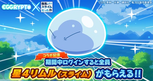 また、期間中ログインしていただいたユーザーの皆様に、限定キャラクター★4「リムル(スライム)」をプレゼントする期間限定ログインボーナスを開催いたします。この機会にぜひEGGRYPTOをお楽しみください。